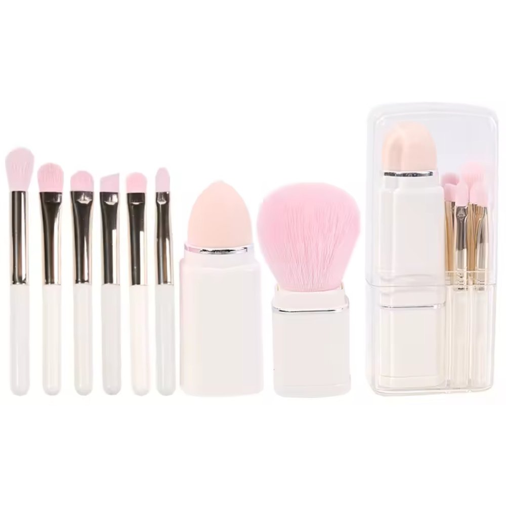 Perfect your makeup with this 8-piece mini brush set. Includes vegan synthetic brushes for eyeshadow and powder, plus a blending sponge. Ideal for travel. Customizable with your logo and available in multiple colors.